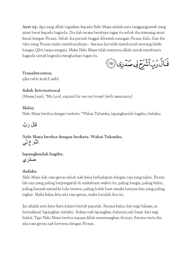 Mereka suruh baginda doa kepada Allah. Doa Nabi Musa ini dapat kita temui dalam Al-Quran Surat Thaha ayat 25 sampai 28. Kumpulan teks bacaan doa Nabi Musa ketika dikejar firaun ketika dizalimi saat dalam kesulitan untuk melancarkan lisan untuk memudahkan segala urusan mohon ampunan mohon hidayah meminta kebaikan dan lain sebagainya.